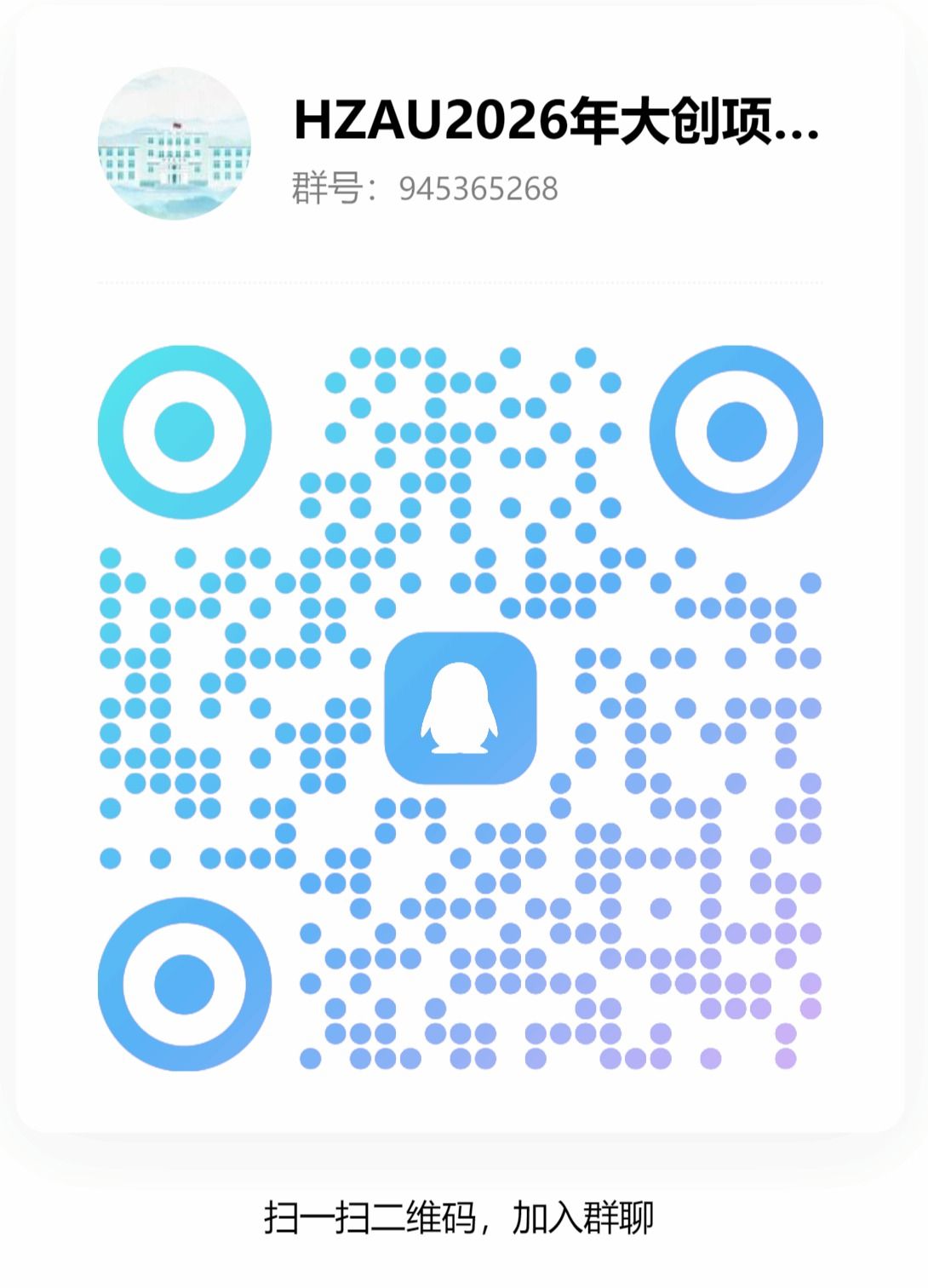 (三)学生如对申报立项、系统填报事宜有疑问,请加入QQ群“HZAU2026年大创项目申报答疑”咨询,群号:945365268。学校近期将组织项目申报宣讲。
